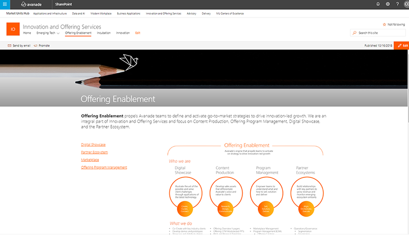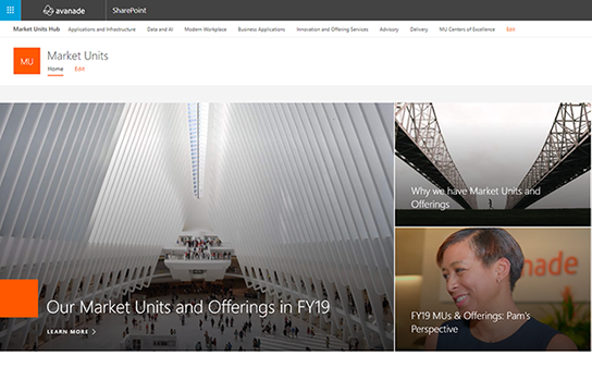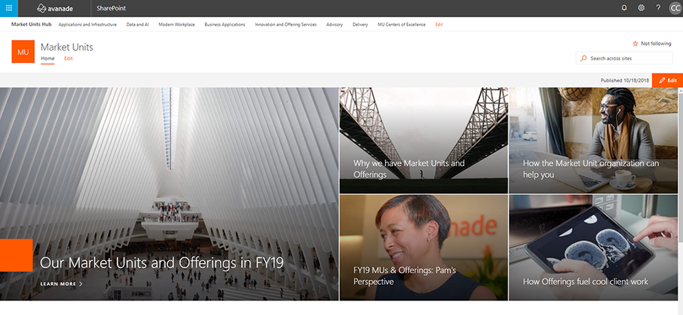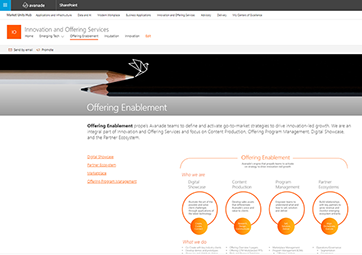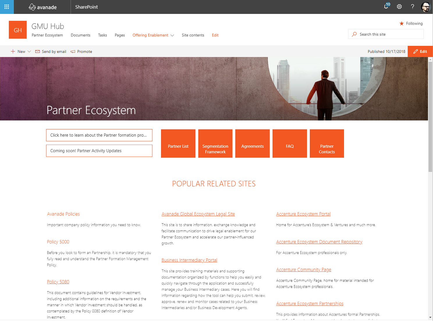 I created site page navigation along with a new look for a modern SharePoint site. This facilitated migrating to a new platform and played out across several global teams. the next few images are from pages on this site.