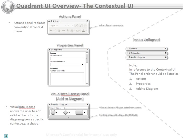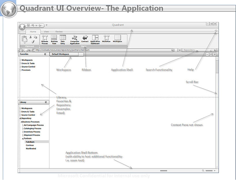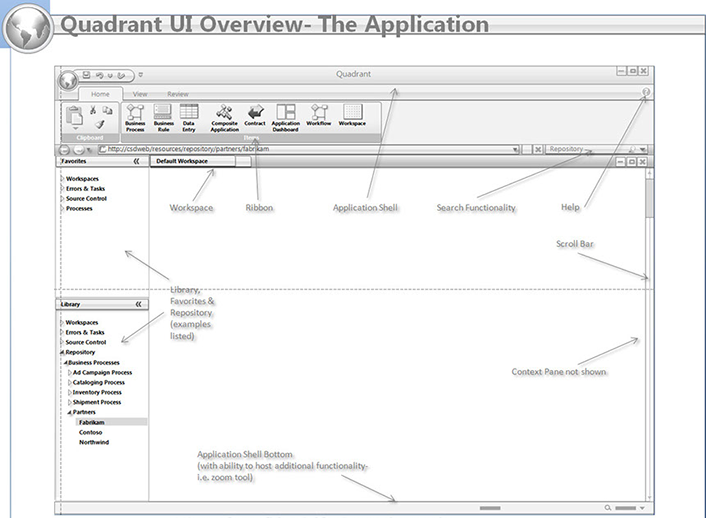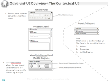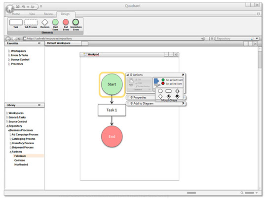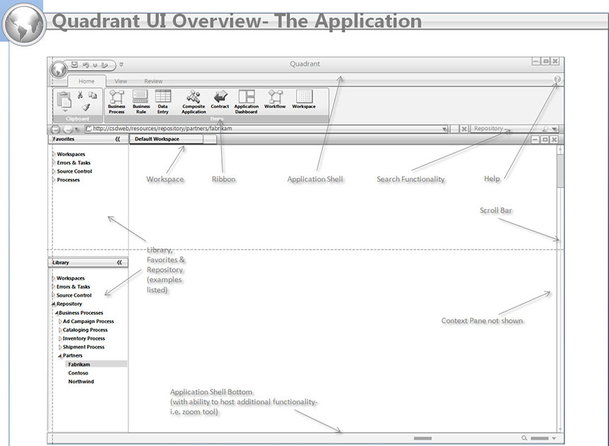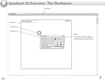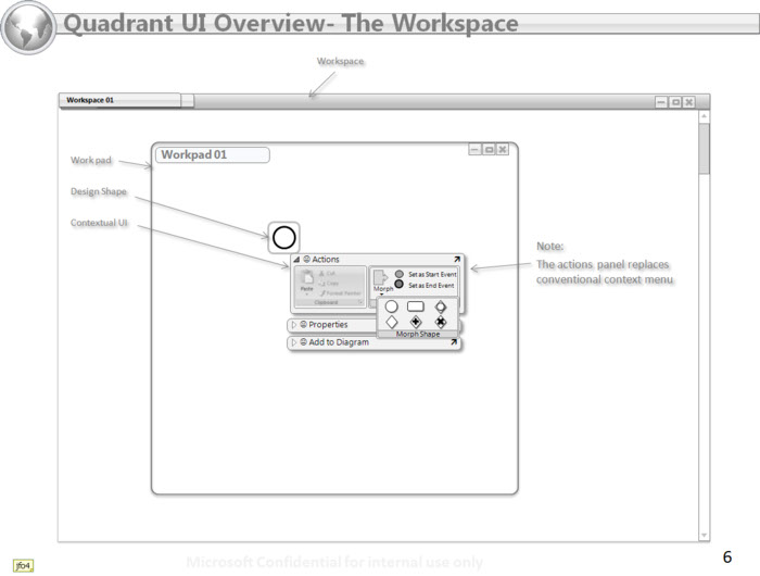 This view shows workspaces, workpads within workspaces, and action panel behaviors. The example uses on of the business process design shapes from the business process ribbon.