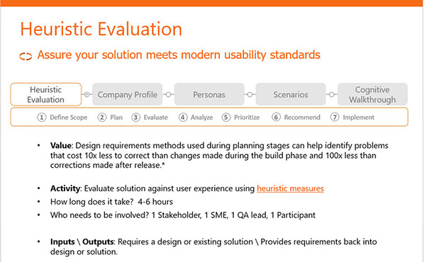In addition to Interface prototyping, I have created cookbook 'templates' like this one. This view is part of a powerpoint deck that walks through the process of conduction a heuristic evaluation and analysis. The resources include templates that are used with the cookbooks. I provided light cross enterprise training with the cookbooks, which included follow up sessions for evaluations to assure quality.
