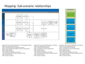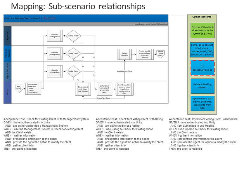 Showing an analysis of scenario breakdown from journey to discreet steps used in a user story for test. This method was adopted by the company as a way to be more agile from design to QA.
