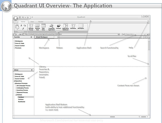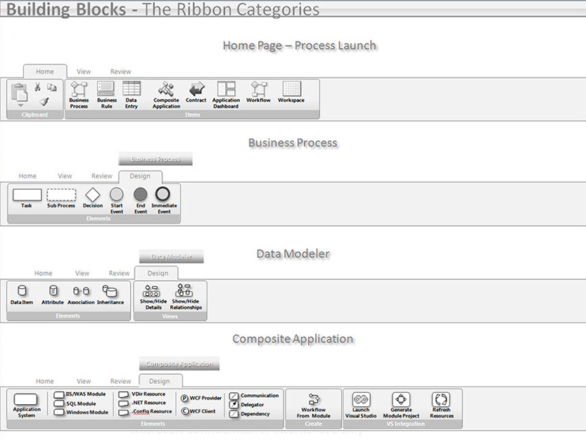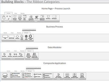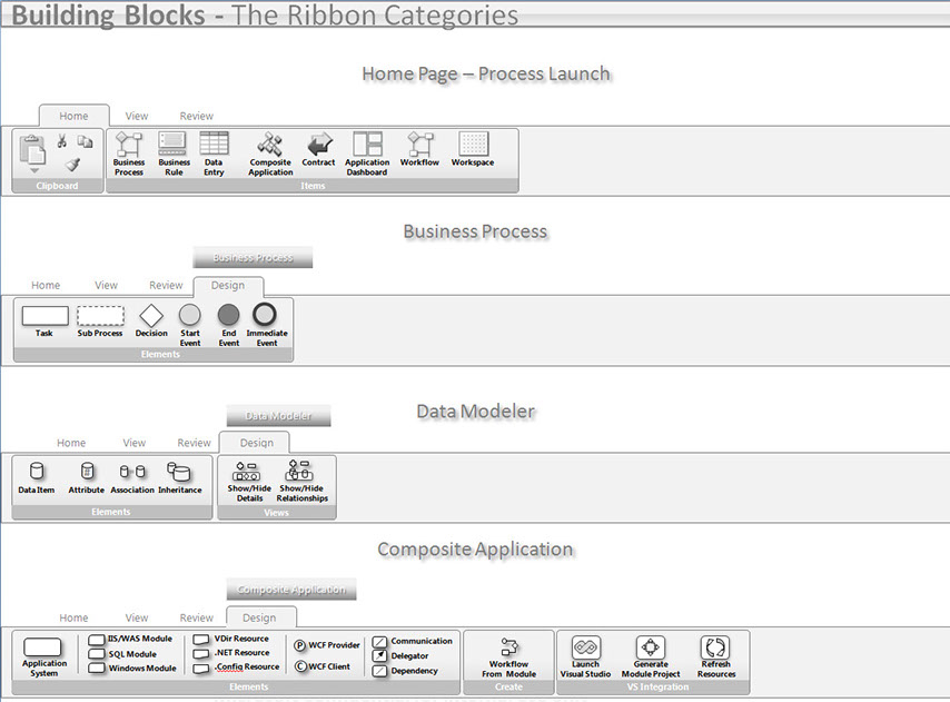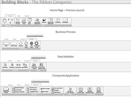 Kit Detail: This shows the ribbons used in the application. Each ribbon represents multiple architects and development teams. The app was extensive, covering enterprise application development through business processes. Application creation could start in any SDLC phase using this app.